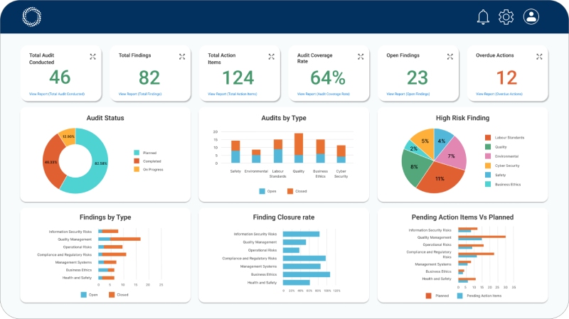 Instantly generate reports on audit categories, including yearly data, open versus closed action items, total audit findings, and suppliers at risk.
