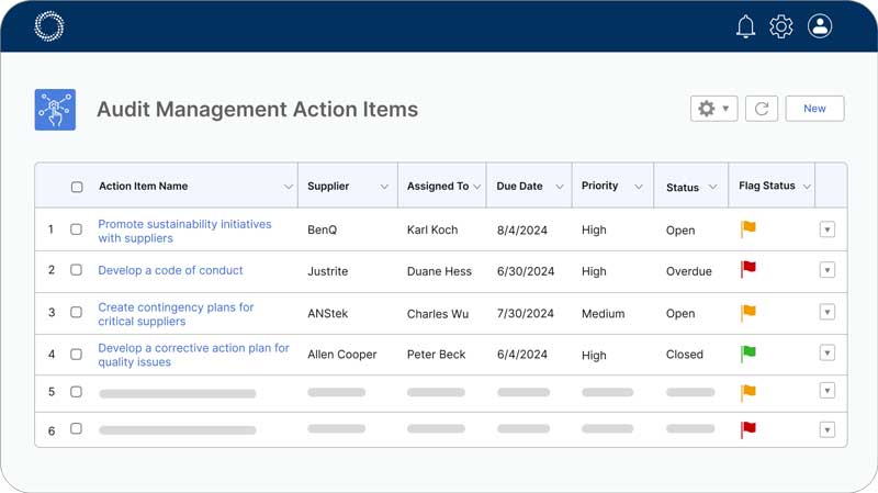 Consolidate your supplier audit action items to gain visibility into specific descriptions, suppliers, owners, and action item statuses.