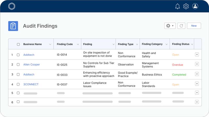Experience one single view of all findings identified by your customers. Easily navigate to view well-ordered lists of findings such as non-conformances, observations, and action items.